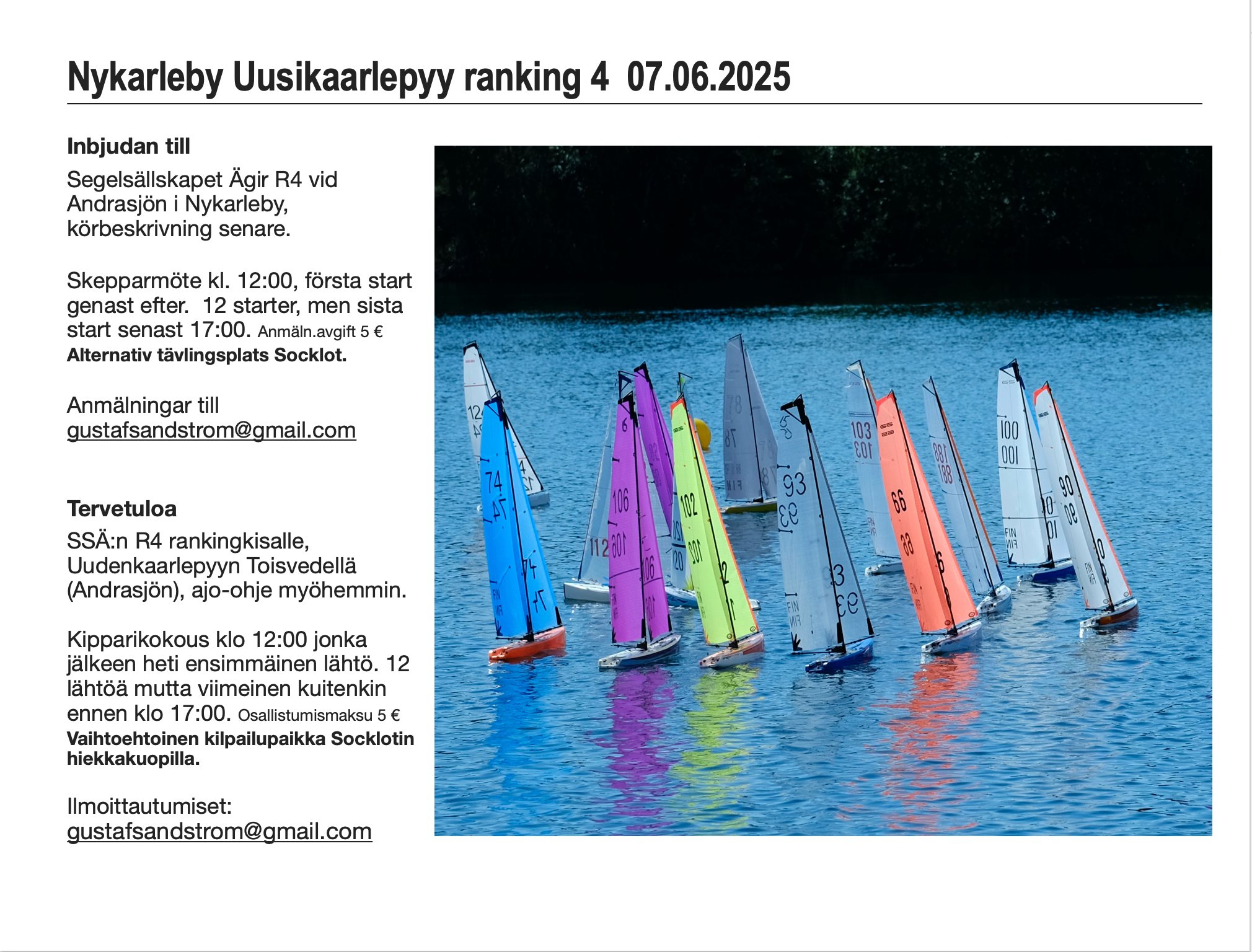 Inbjudan till Segelsällskapet Ägir R4 vid Andrasjön i Nykarleby, körbeskrivning senare. Skepparmöte kl. 12:00, första start genast efter. 12 starter, men sista start senast 17:00. Anmäln.avgift 5 € Alternativ tävlingsplats Socklot.