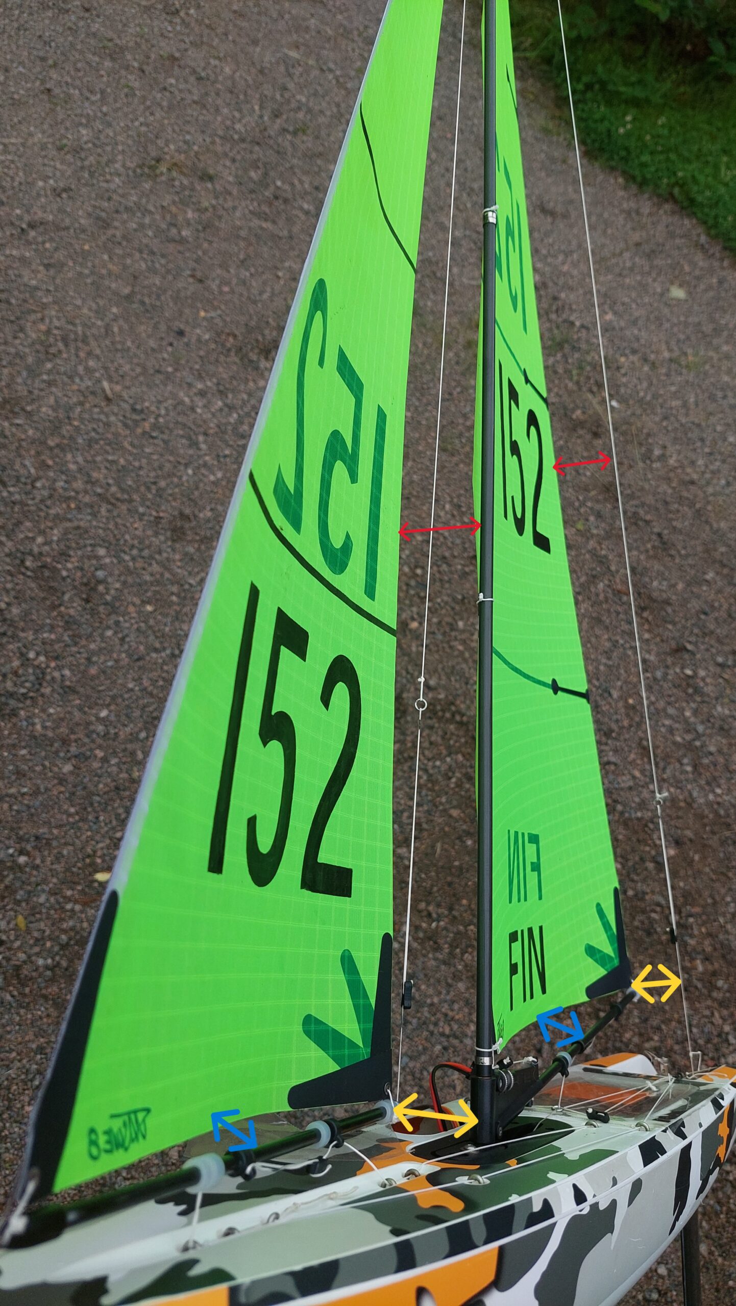 Itse säädöt. Siniset nuolet: (purjeen vatsa) edessä 25 mm, takana 25 mm. Kun tuuli kovenee, lisää vatsaa eteen ja vähennä takaa. Tuulen hiljentyessä vähennä vatsaa edestä, lisää taakse. Keltaiset nuolet eli skuuttikulmat: edessä 40 mm, takana 15mm. Fokan puomin tulisi sisään vedettynä olla kannessa veneen vasemmalla puolella olevan metallirenkaan yläpuolella. Jos puoli on liian ”sisällä”, ei tuuli pääse kulkemaan fokan etupuolelta ison purjeen takapuolelle (huom. fokan twisti). Ison purjeen puomi ei saa olla sisään skuutattuna veneen keskilinjalla. Parempi jos ison puomin pää on rungossa olevan laatikon sisäreunassa. Mitta puomin päästä veneen takana olevaan naruun on n. 15mm. Tähän liittyy myös punaiset nuolet eli purjeiden twistit. Fokan twisti tulisi olla n. 60mm purjeen reunasta mastoon. Jos fokan ja maston välinen sola on liian kiinni, purje ”pakkaa” eikä vene kulje. Ison twisti olisi hyvä olla n. 40 mm. Kun tuuli kovenee, kannattaa lisätä twistiä tai säätä ison skuuttia hiukan auki. Näin vähennät tuulen purjeisiin kohdistavaa voimaa.
